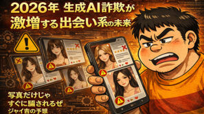最近の報告2026年1月1日(木)あけおめ!最近の出会い系を見ていて、ジャイ吉が正直感じた不安と予想 2026年の出会い系の最新展望をジャイ吉が解説。生成AI詐欺や出会えないパターン、騙されないための対策、優良出会い系の選び方まで実体験をもとにまとめています 2026.01.31最近の報告