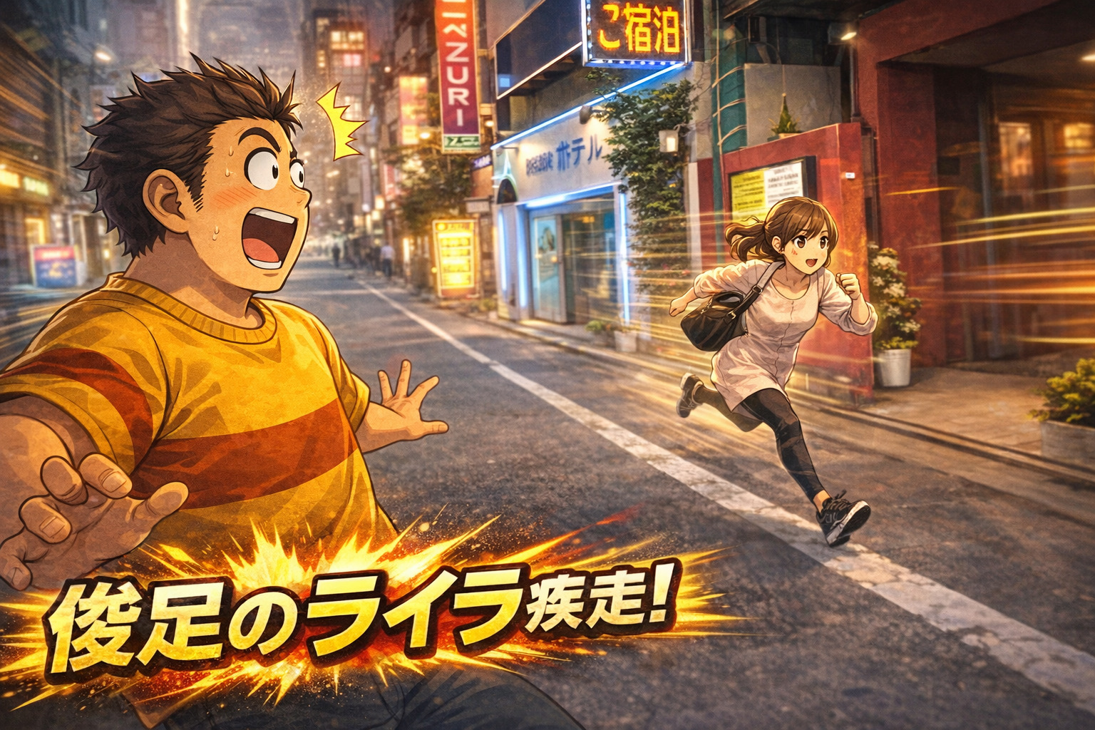 おんぼろのラブホテルのアズーリから全力疾走で出てくる女。この女は急いでいるから走っているわけではない。1分03秒から動画を見るとわかりやすい。