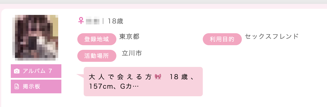 肌感としては、ややディープ感のあるサイトだな。なので出会い系で昔から遊んでいる、慣れている子が多い。「元カレとマンネリ」とか「刺激欲しい」ってタイプと出会いやすいな。