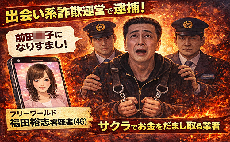 AKB48などのアイドルになりすまして男性とメールをし、出会い系サイトに登録させて現金をだまし取ったとして、警視庁は、広告会社「フリーワールド」社長の福田裕志容疑者(46)=東京都新宿区=を詐欺容疑で逮捕し、15日発表した。容疑を否認しているという。