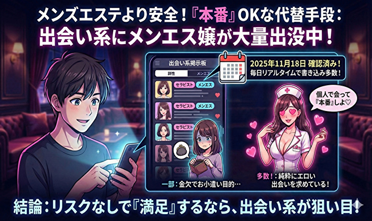 メンズエステで本番を求めるのはかなりリスクが高くトラブルに発展する可能性もある、代替手段として出会い系でメンズエステのセラピストを見つけると言うのはかなり効果的だと思う。