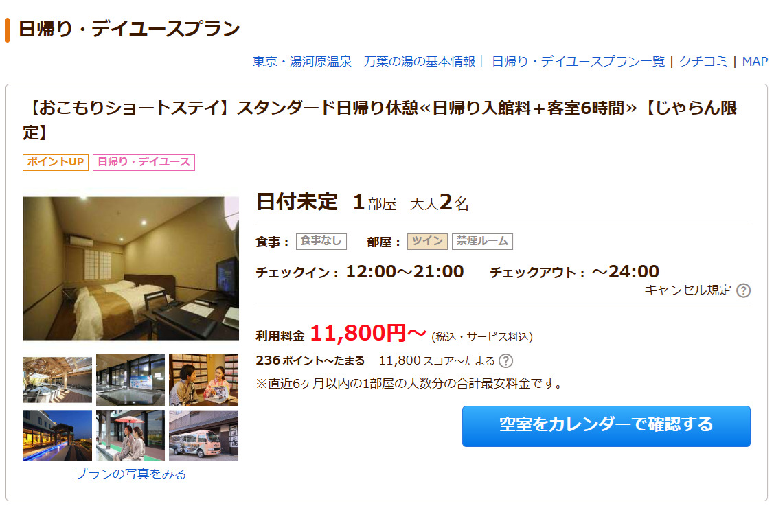 コミュニティから来ました!温泉大好きなんで一緒に温泉行ってまったりしませんか?と誘ってみて何通かやりとりして、オレが事前に調べて用意していたプランを提案して町田にあるスーパー銭湯の万葉の湯にデイユースに行った。お互い仕事が休みの土曜日に予約して突撃。個室に6時間の滞在もできて部屋にベッドもしっかりあって温泉も入り放題。それで2人で11,800円ってめちゃくちゃコスパが良いと思う。