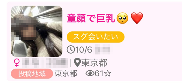 今回は若い女性と会いたかったから「童顔」というキーワードで女性を探した。童顔のキーワードだけでもだいぶ女性は絞る事ができるからピンポイントで出て来た女性を誘いというやり方で会ったんだ。
